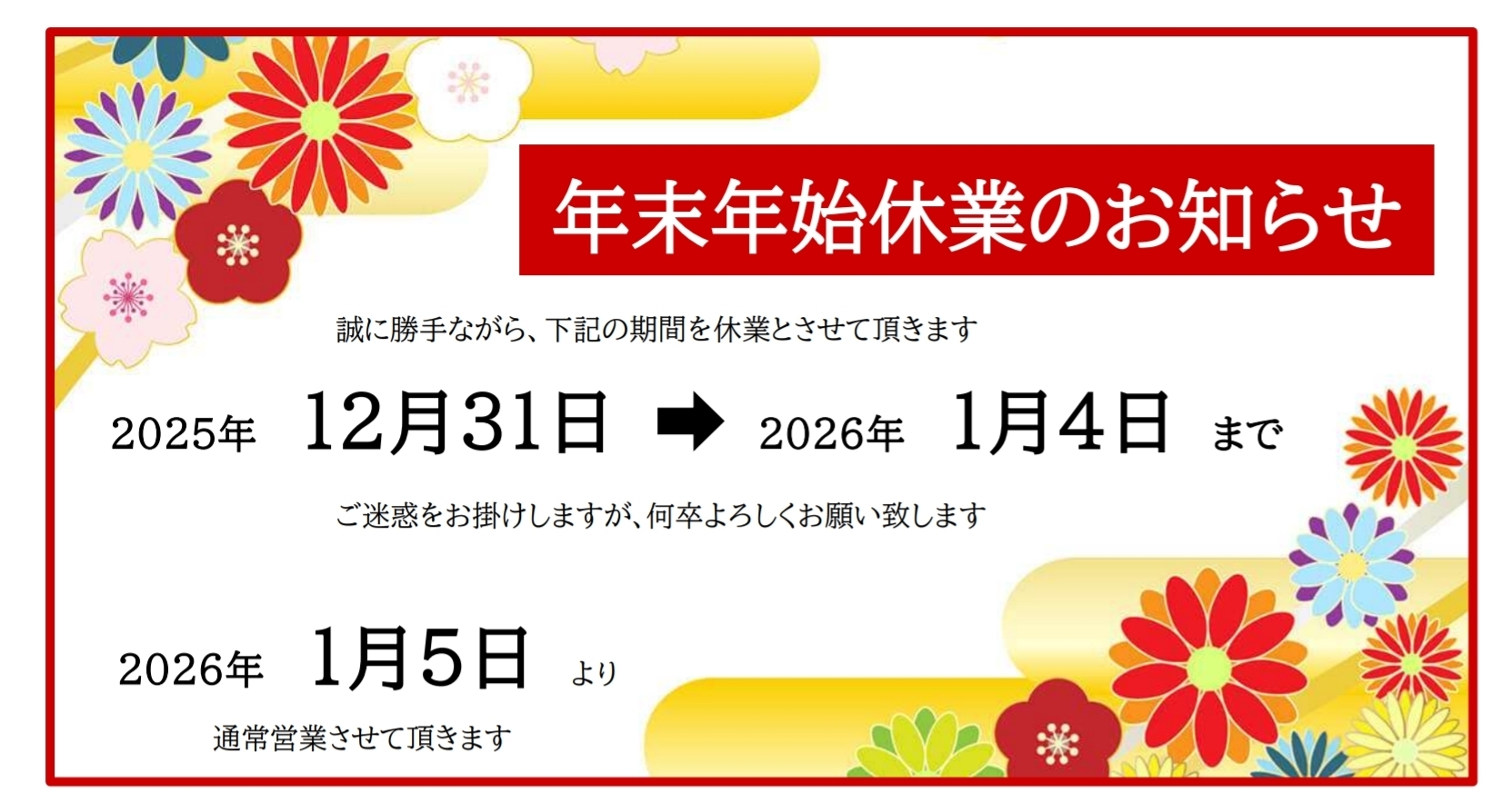 2025年→2026年、年末年始の休業につきまして、下記の通りお知らせいたします。